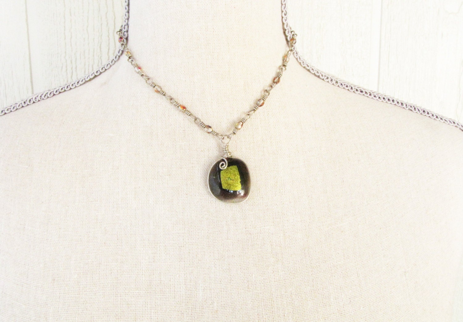 Yellow Green Iridescent Dichroic Fused Glass Necklace Sterling Silver Pendant Crystal Necklace Handmade Jewelry fused glass jewelry